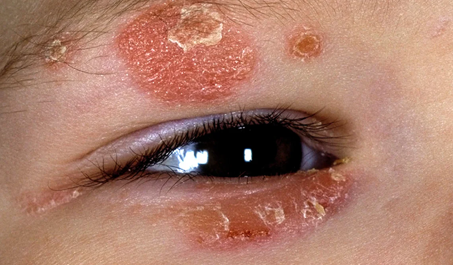 死亡的細(xì)胞會迅速轉(zhuǎn)移到皮膚外層并堆積起來,形成覆蓋著片狀銀色鱗屑的褪色斑塊。皮膚還會發(fā)炎。
