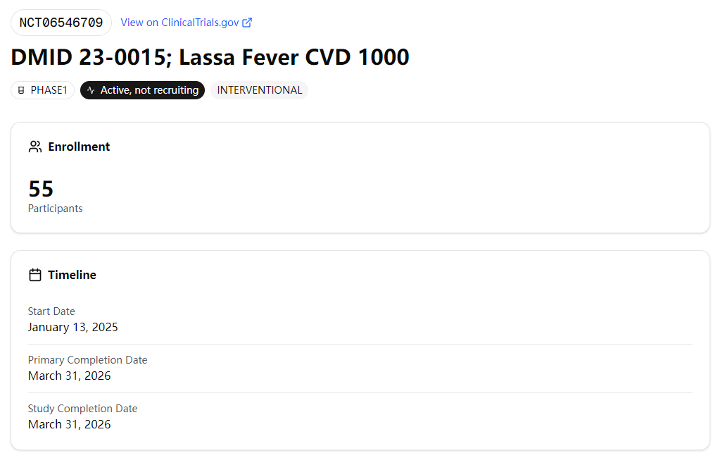 一項(xiàng)開創(chuàng)性的CVD 1000試驗(yàn)正在測試一種“一箭雙雕”的疫苗。候選疫苗LASSARAB將拉沙病毒蛋白與狂犬病病毒載體結(jié)合,激發(fā)對兩種疾病的同步免疫。[5]