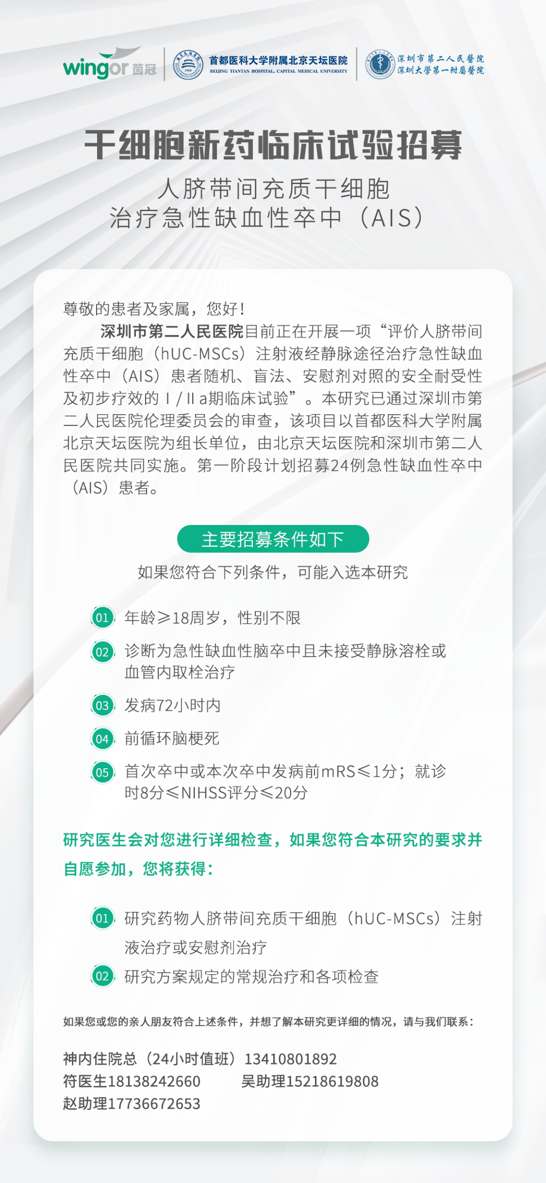 現(xiàn)階段,該公司正與首都醫(yī)科大學(xué)附屬北京天壇醫(yī)院和深圳市第二人民醫(yī)院合作,共同實(shí)施名為“評(píng)價(jià)人臍帶間充質(zhì)干細(xì)胞治療急性缺血性卒中患者的Ⅰ/Ⅱa期臨床試驗(yàn)”。該研究已獲深圳市第二人民醫(yī)院倫理委員會(huì)批準(zhǔn)。
