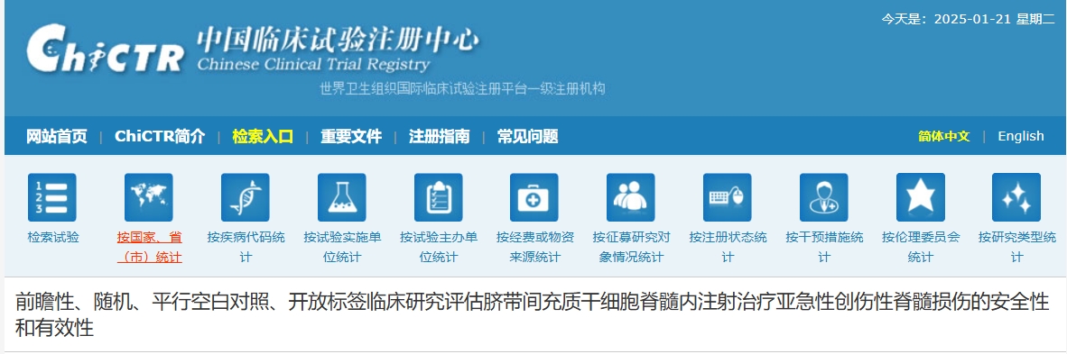 2025年1月20日,西安高新醫(yī)院在《中國(guó)臨床試驗(yàn)中心》上注冊(cè)了一項(xiàng)關(guān)于“前瞻性、隨機(jī)、平行空白對(duì)照、開放標(biāo)簽臨床研究評(píng)估臍帶間充質(zhì)干細(xì)胞脊髓內(nèi)注射治療亞急性創(chuàng)傷性脊髓損傷的安全性和有效性”的臨床試驗(yàn)正在招募患者,這一消息無疑為廣大脊髓損傷患者帶來了新的希望!