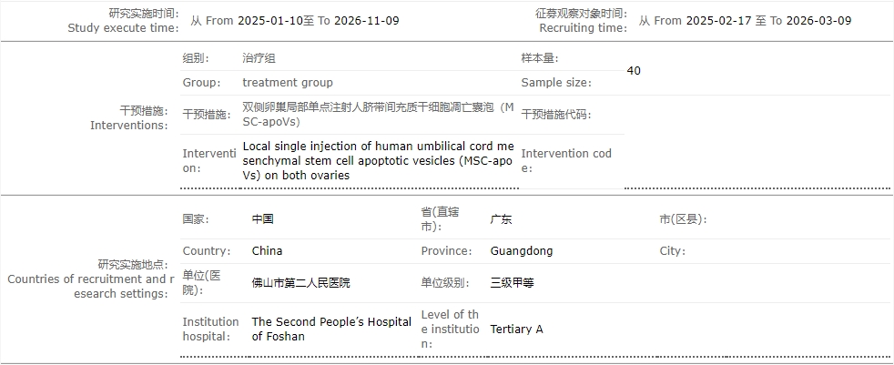 臨床試驗(yàn)一:人臍帶間充質(zhì)干細(xì)胞來源的凋亡囊泡(MSC-apoVs)治療早發(fā)性卵巢功能不全的臨床研究(佛山市第二人民醫(yī)院)
