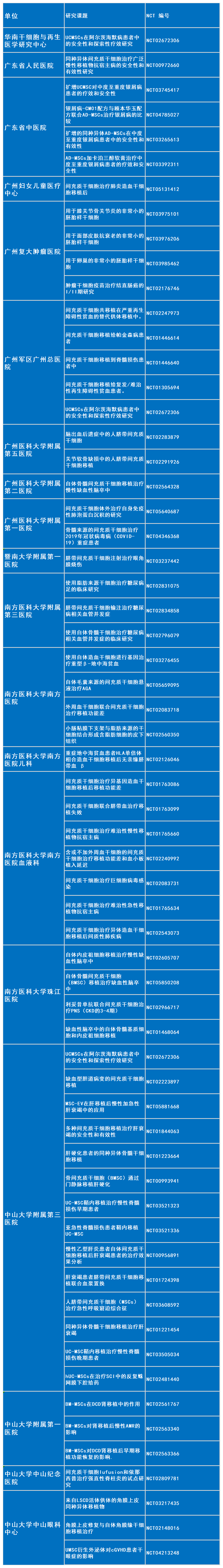 廣州,這座歷史悠久而又充滿活力的南方城市,以其開放的城市精神和先進的醫(yī)療水平,正在引領著中國的干細胞研究。在這里,一群優(yōu)秀的醫(yī)療機構(gòu)正在積極開展干細胞臨床試驗,他們在ClinicalTrials.gov注冊了多個干細胞相關的研究課題(截止于2023年5月),旨在探索干細胞治療在治療各種疾病中的可能性。這些機構(gòu)包括: