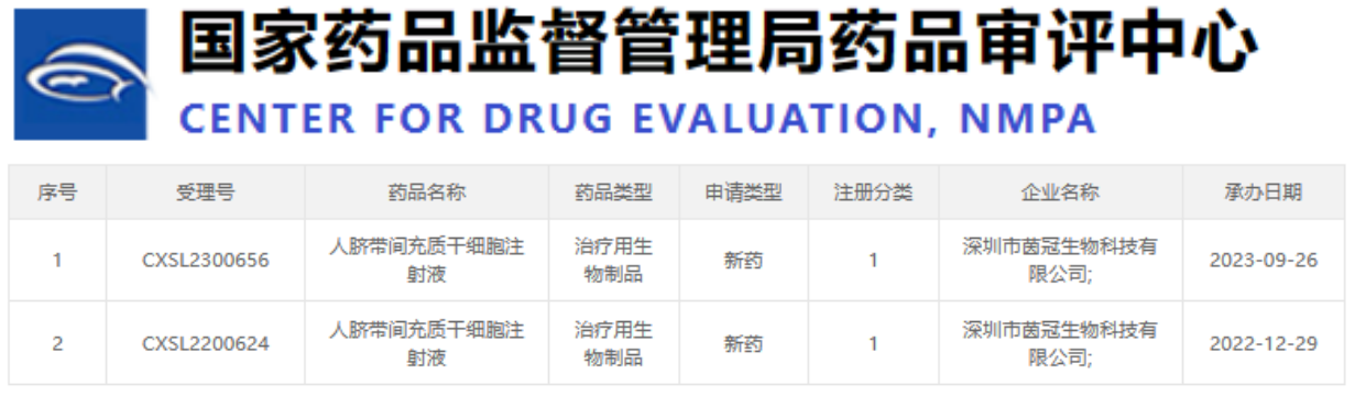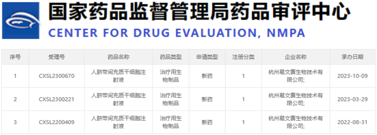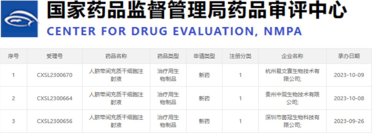 最近,國(guó)家藥品監(jiān)督管理局藥品審評(píng)中心又公示了三家公司的干細(xì)胞新藥申請(qǐng),這三家公司分別是深圳市茵冠生物科技有限公司(CXSL2300656)、貴州中觀生物技術(shù)有限公司(CXSL2300664)和杭州易文賽生物技術(shù)有限公司(CXSL2300670)。值得一提的是,這次受理新藥名稱均為“人臍帶間充質(zhì)干細(xì)胞注射液”。