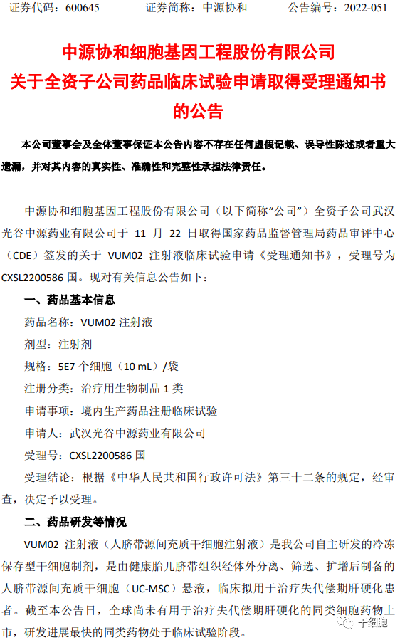 中源協(xié)和細(xì)胞基因工程股份有限公司(以下簡稱“公司”)全資子公司武漢光谷中源藥業(yè)有限公司于11月22日取得國家藥品監(jiān)督管理局藥品審評(píng)中心(CDE)簽發(fā)的關(guān)于VUM02注射液臨床試驗(yàn)申請(qǐng)《受理通知書》,受理號(hào)為CXSL2200586 國?,F(xiàn)對(duì)有關(guān)信息公告如下: