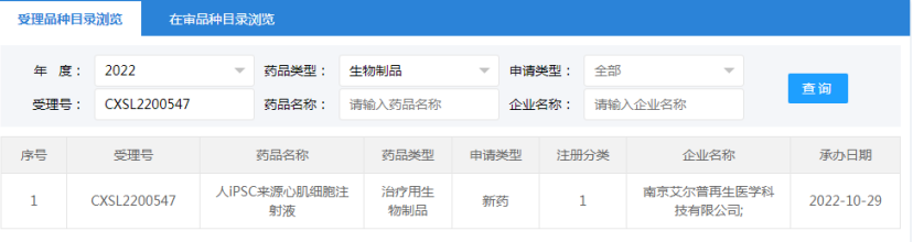 2022年4月28日武漢睿健醫(yī)藥科技有限公司的“人源多巴胺能前體細(xì)胞注射液”(受理號:CXSL2200194)無法查到IND評審信息。