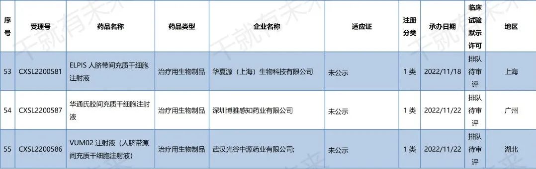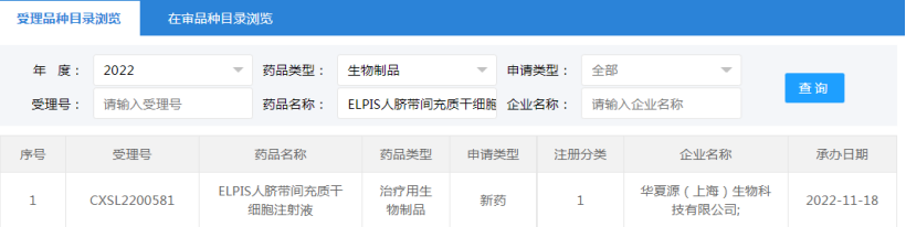 2022年8月31日杭州易文賽生物技術(shù)有限公司的“人臍帶間充質(zhì)干細(xì)胞注射液”(受理號:CXSL2200409)無法再查到IND評審信息。