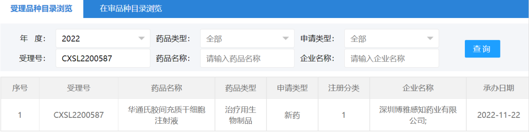 2022年11月22日,深圳博雅感知藥業(yè)有限公司“華通氏膠間充質(zhì)干細(xì)胞注射液”的藥物臨床試驗申請獲受理(受理號:CXSL2200587)。這是深圳博雅感知藥業(yè)第一款受理的干細(xì)胞藥物。