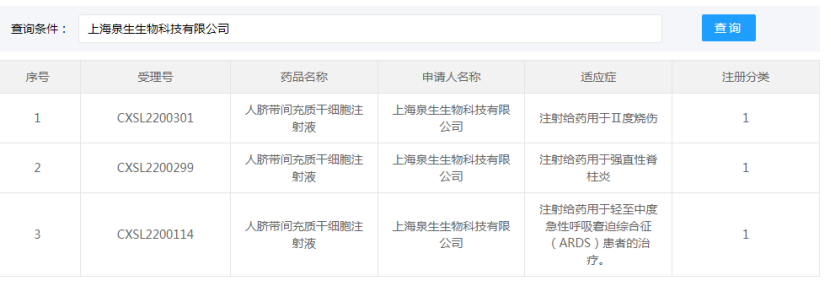 上海泉生生物科技有限公司的“人臍帶間充質(zhì)干細(xì)胞注射液”的藥物臨床試驗申請獲得默示許可(受理號:CXSL2200299與CXSL2200301),適應(yīng)證為:強(qiáng)直性脊柱炎和Ⅱ度燒傷。
