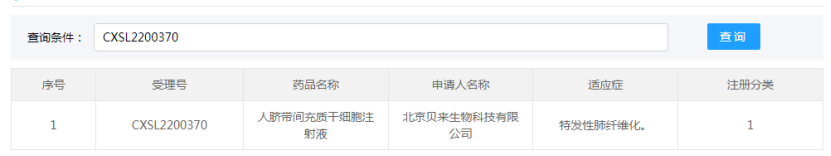 北京貝來生物科技有限公司的“人臍帶間充質(zhì)干細(xì)胞注射液”的藥物臨床試驗申請獲得默示許可(受理號:CXSL2200370),適應(yīng)證為:特發(fā)性肺纖維化。