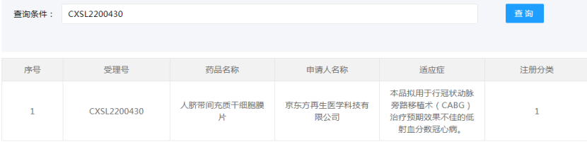 2022年11月22日,藥品監(jiān)督管理局藥品審評中心官網(wǎng)顯示,京東方再生醫(yī)學(xué)科技有限公司自主研發(fā)的“人臍帶間充質(zhì)干細(xì)胞膜片”(受理號:CXSL2200430)獲得新藥臨床試驗?zāi)驹S可,適應(yīng)證為:用于行冠狀動脈旁路移植術(shù)(CABG)治療預(yù)期效果不佳的低射血分?jǐn)?shù)冠心病。