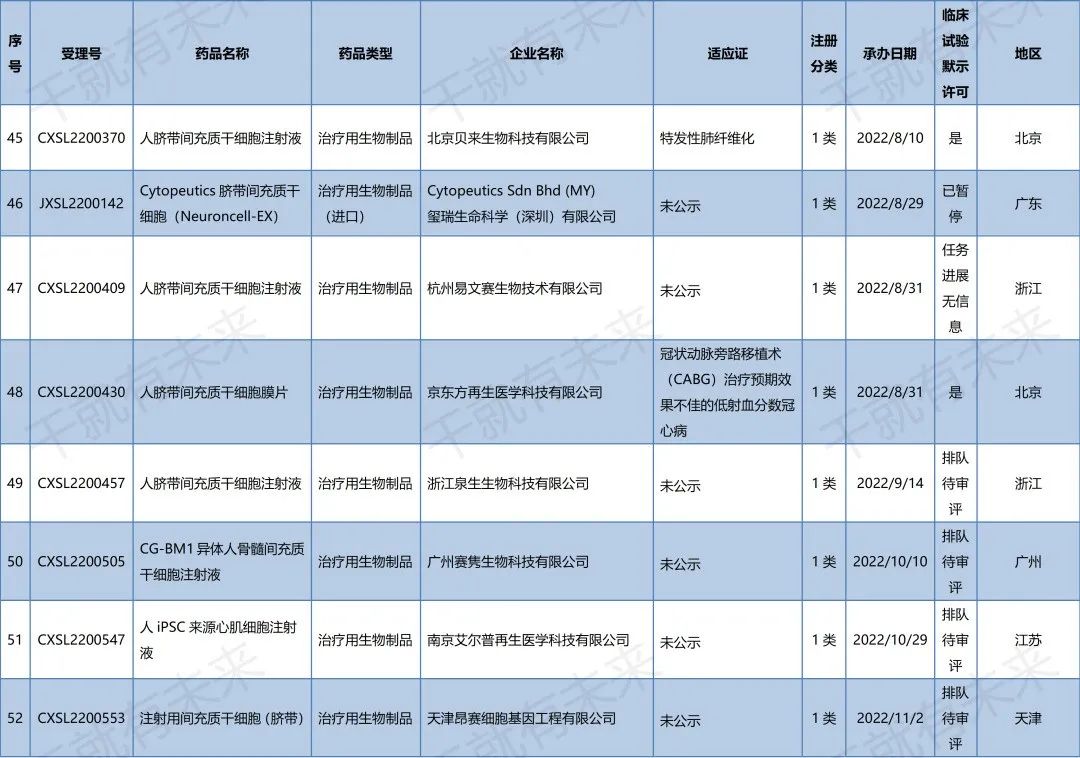 中國干細(xì)胞藥物注冊申報進(jìn)展(2022年9月1日-11月30日)