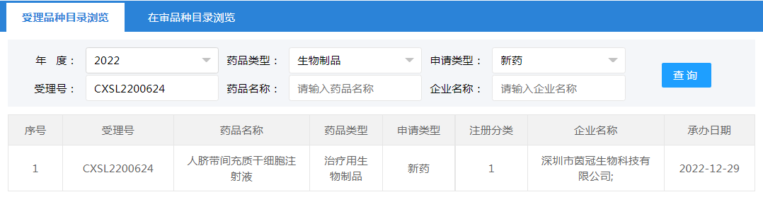 2022年12月29日,深圳市茵冠生物科技有限公司“人臍帶間充質(zhì)干細(xì)胞注射液”的藥物臨床試驗申請獲受理(受理號:CXSL2200624)。這是深圳市茵冠生物第一款獲得受理的干細(xì)胞注射。