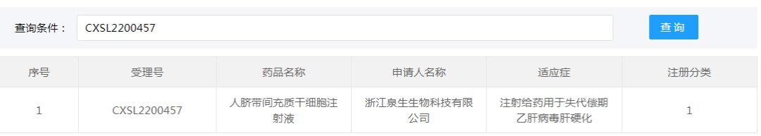 ▉ 干細(xì)胞藥物新增默示許可依據(jù)2023年1月2日,CDE官網(wǎng)顯示,浙江泉生生物科技有限公司的“人臍帶間充質(zhì)干細(xì)胞注射液”(受理號:CXSL2200457)獲得新藥臨床試驗?zāi)驹S可,適應(yīng)證為:注射給藥用于失代償期乙肝病毒肝硬化。這是該干細(xì)胞注射液的第四種適應(yīng)證,此前已獲得默示許可用于注射給藥輕至中度急性呼吸窘迫綜合征(受理號:CXSL2200114)、強直性脊柱炎(受理號:CXSL2200299)、Ⅱ度燒傷(受理號:CXSL2200301)的臨床試驗。